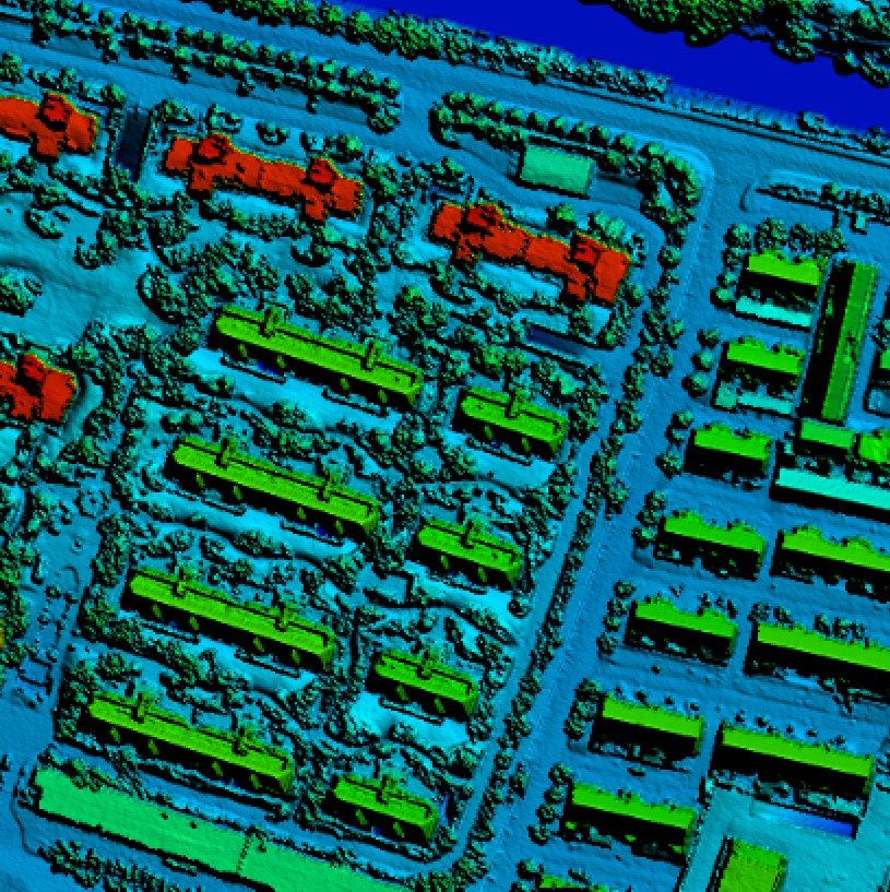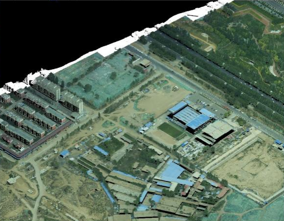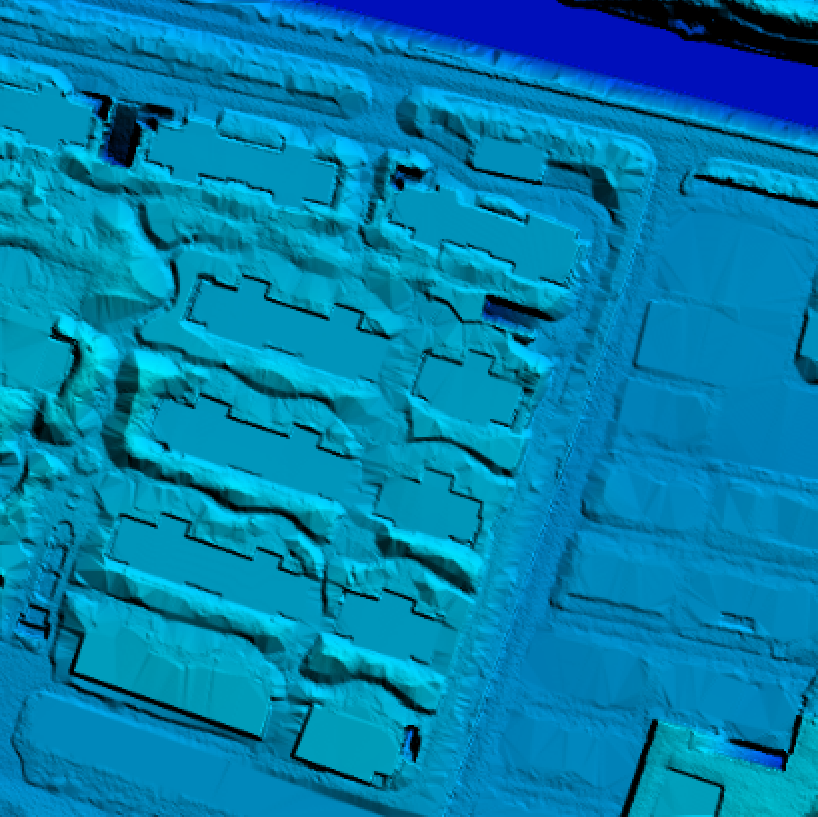 以分類點云中所有地表點以及地表之上的植被、建筑物、構筑物等自然及人工地物表面形態(tài)上的點均作為特征點,并以帶有高程信息的面狀水域范圍線作為特征線,構建并輸出數(shù)字表面模型(DSM)產品。