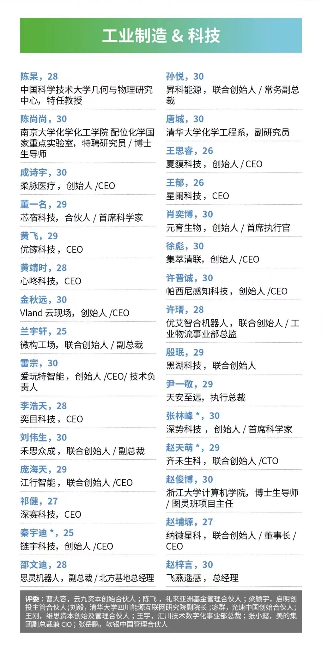今年評(píng)選由近50位知名企業(yè)家、風(fēng)險(xiǎn)投資人、藝術(shù)家、高校教授以及業(yè)內(nèi)意見領(lǐng)袖擔(dān)任評(píng)委,主要從影響力、績效和創(chuàng)新三大維度考察候選者。共有5個(gè)行業(yè)154位年輕人登上榜單,上榜者平均年齡為28.2歲,超過半數(shù)擁有碩士、博士及以上學(xué)歷。