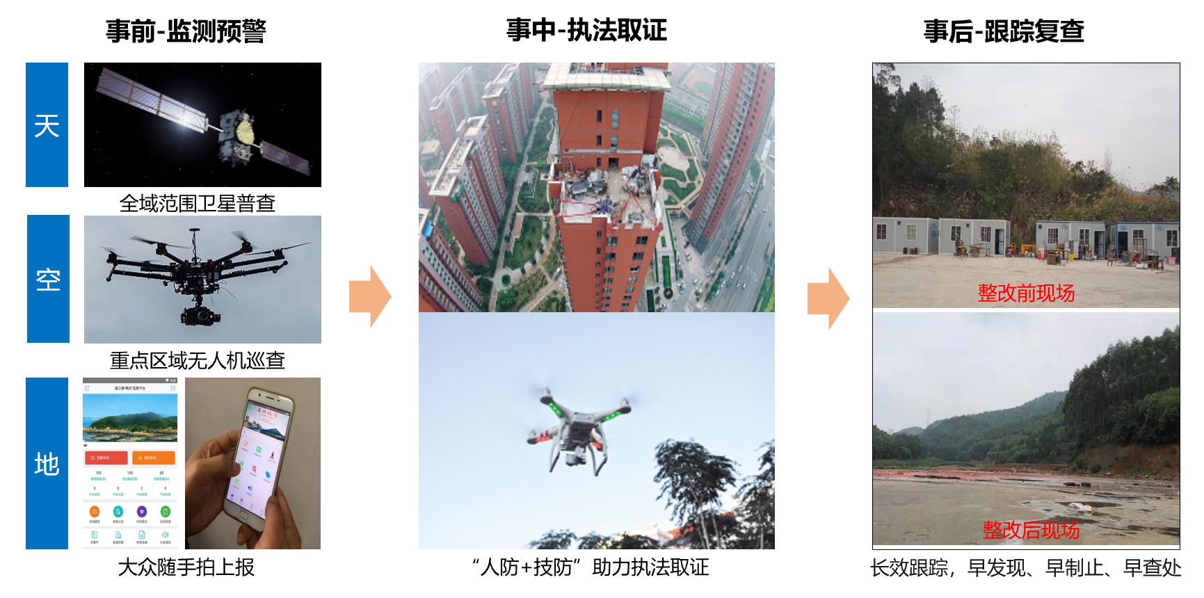 通過衛(wèi)星、無人機(jī)、APP等技術(shù)手段,打造衛(wèi)星影像監(jiān)測、高清航拍監(jiān)測和人工無縫巡查相結(jié)合方式,形成“地面上報、空中巡查、衛(wèi)星監(jiān)測”的“天羅地網(wǎng)”,實現(xiàn)事前監(jiān)測預(yù)警、事中執(zhí)法取證、事后跟蹤復(fù)查覆蓋業(yè)務(wù)全生命周期,讓“兩違”無處遁形,極大地提高違法建設(shè)的防控和查處效率。