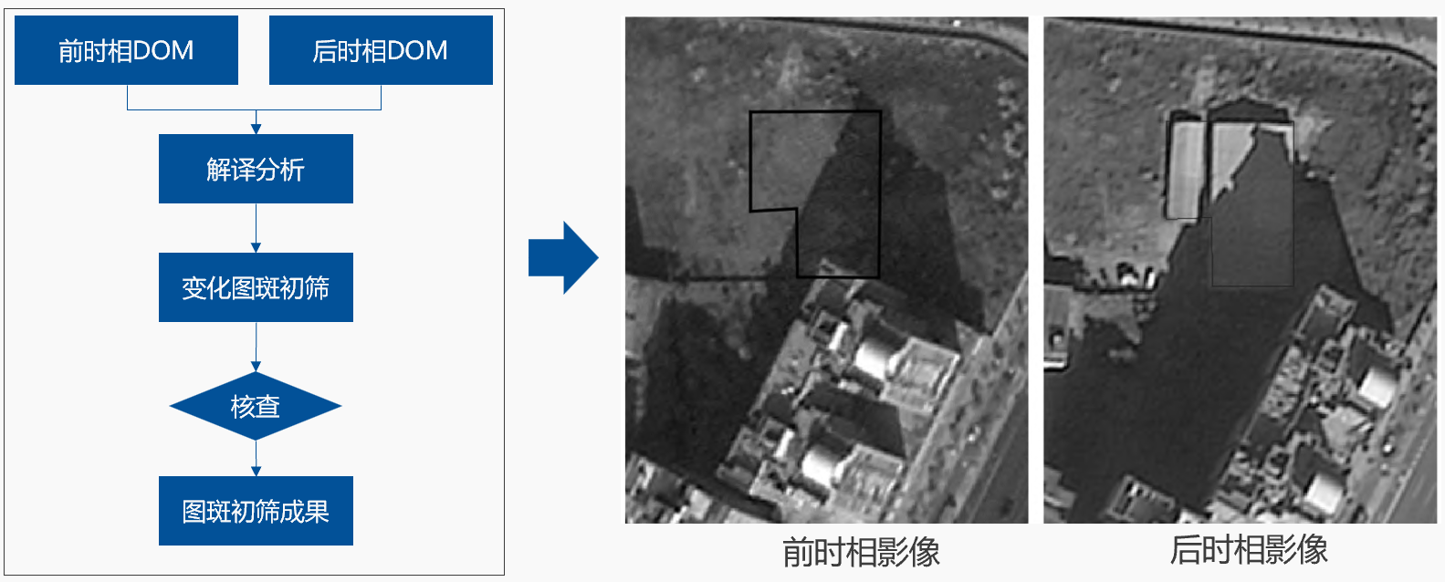 基于智能解譯中心平臺,利用多期數(shù)字正射影像數(shù)據(jù)進(jìn)行變化監(jiān)測處理,檢測變化建設(shè)用地或違法建筑圖斑。逐塊逐片比對影像紋理,判讀變化圖斑,并逐一圈定疑似變化圖斑。
