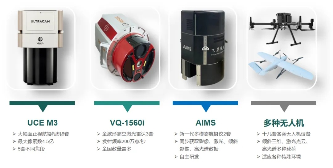 ●1臺(tái)5億像素傾斜攝影相機(jī),可搭載固定翼飛機(jī)和直升機(jī);